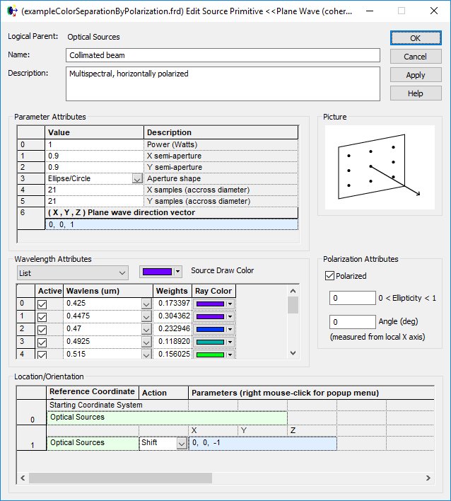The source is a Plane Wave (coherent) type Source Primitive that is X-polarized.. The "Synthesize a Color" feature was used to create a range of evenly spaced wavelengths with proper weighting to simulate the color "white".