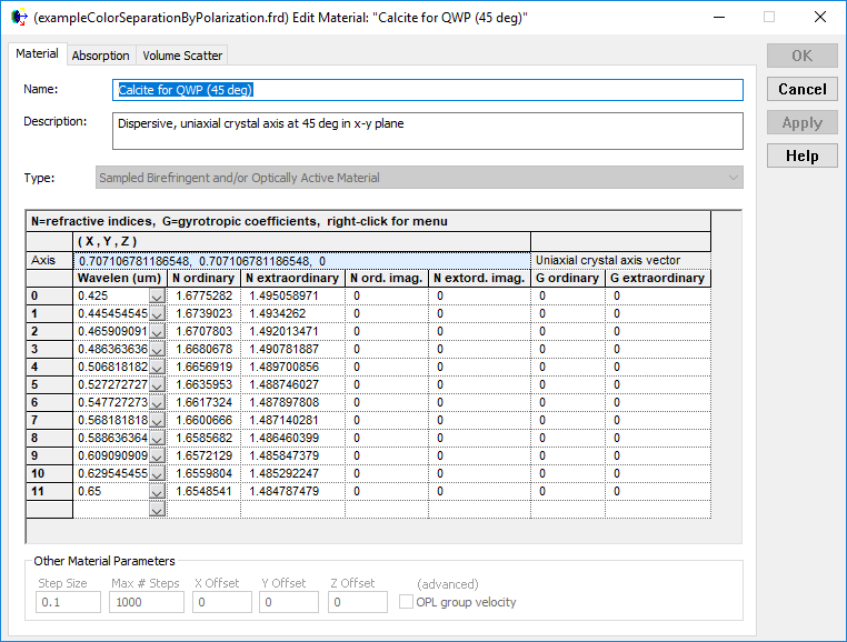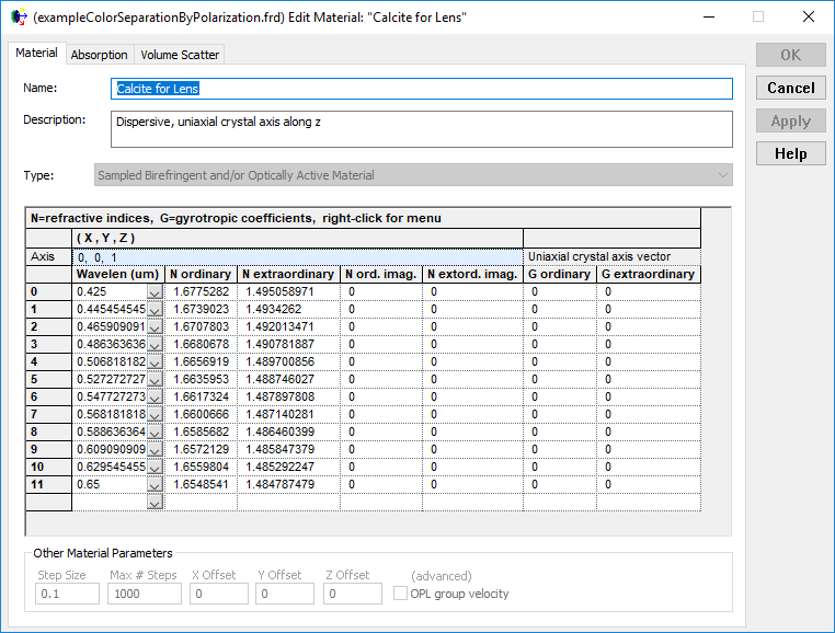 Two versions of the calcite material will be defined, each with a unique crystal axis orientation. Shown below is the dialog of the calcite material definition that is used for the Lens object. Note that the Axis vector of this calcite material definition is aligned to the (0,0,1) axis, which is interpreted in the local coordinate system of the Lens node when assigned to that object.