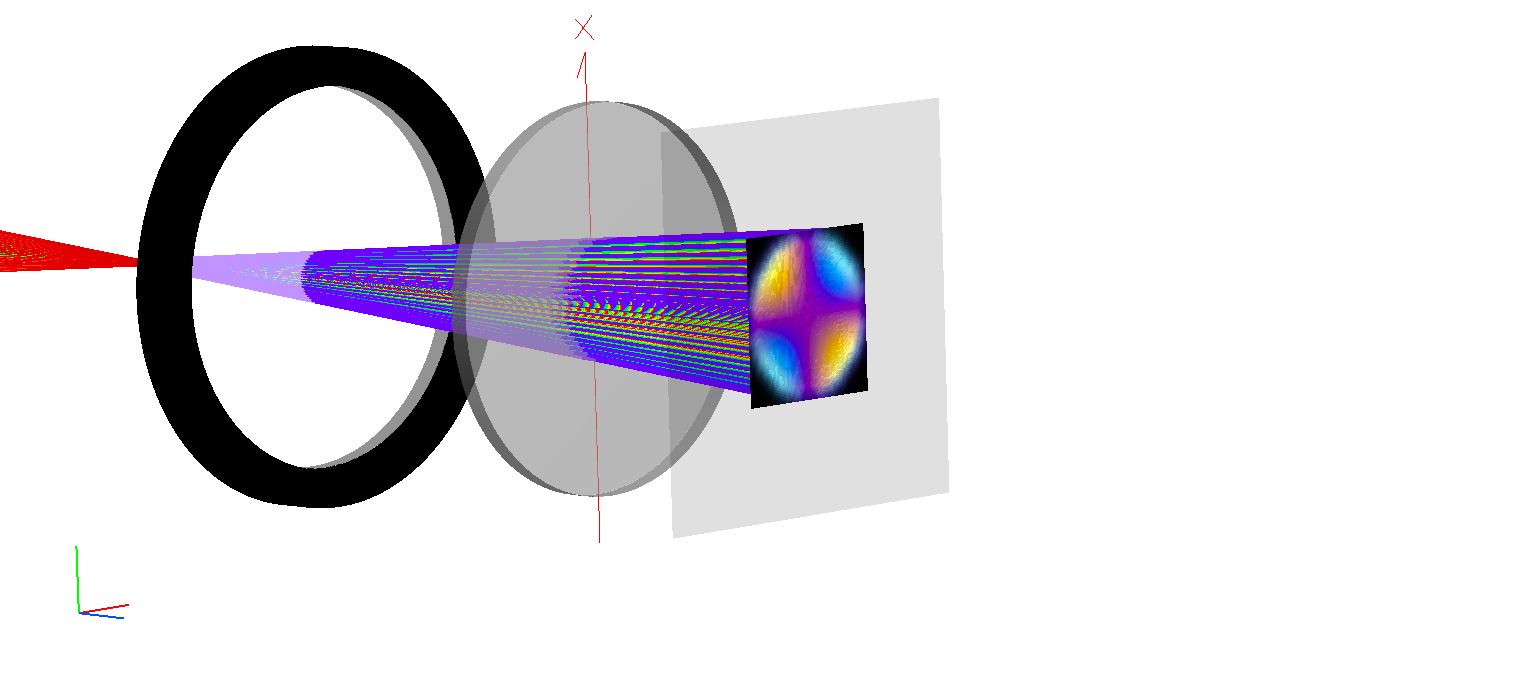 Color Separation by Polarization This example illustrates the spatial separation of color resulting from passage through birefringent optical elements. Polarized white light is incident upon a simple lens made from calcite, a uniaxial crystal, the converging light bundle continues through a waveplate and a polarizing element, continues and is captured on a screen. At the screen, the Color Image feature is used to display the spatially distributed spectra.