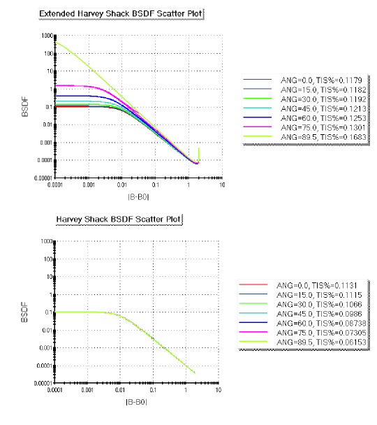 The two |b - b0| plots below show the behavior for an Extended Harvey-Shack model with parameters b0=0.1, L=0.01, S=-1.5, P = 2, Q = 1 and a standard Harvey-Shack with parameters b0=0.1, L=0.01, S=-1.5. Note that all of the curves of the standard shift-invariant Harvey-Shack model fall on top of each other while the variation on the specular angle is exhibited in the Extended Harvey-Shack by a separation of the curves. Furthermore, notice that there is a distinct "tail" in the Extended Harvey-Shack model that is not present in the standard Harvey-Shack representation.