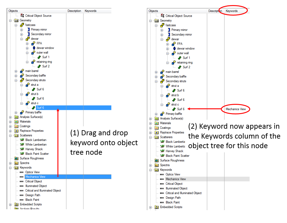 Properties such as coatings and raytrace controls can be assigned to objects on the tree by routing them through the keyword nodes rather than individually dragging and dropping properties onto the destination objects themselves. By dragging and dropping a coating onto a keyword, for example, the coating property is then automatically assigned to any surface node which has the keyword assigned to it. This process is illustrated in the image below.