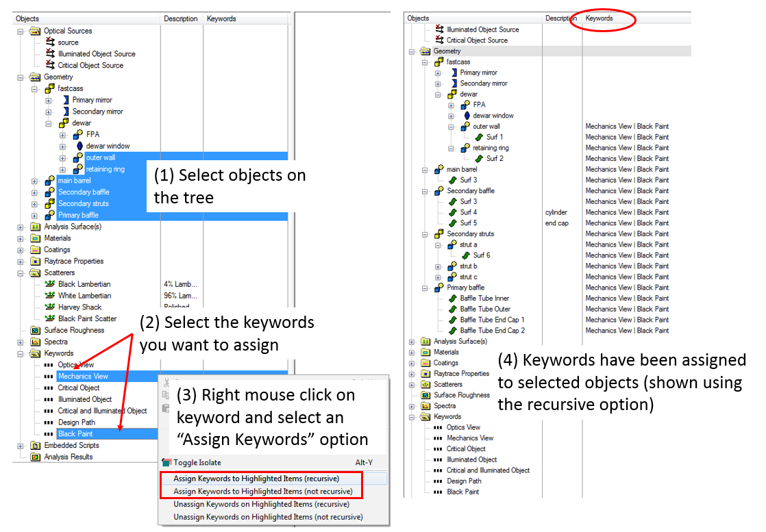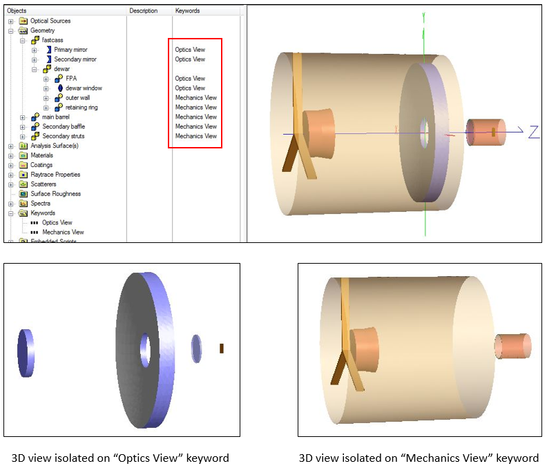 Managing Isolated Views Isolating groups of objects in the 3D view is particularly useful when making modifications to a particular subsystem of a model, redrawing raytrace paths through particular sections, or for generating presentation graphics. In this context, Keywords can be a potentially useful tool for managing different isolated views. For example, consider the simple Cassegrain telescope model shown below, where the keywords "Optics View" and "Mechanics View" have been created and recursively assigned to the components shown in the object tree. This particular scheme assigns the "Optics View" keyword to the optical components defining the imaging path and the "Mechanics View" to the baffle and strut hardware components. By right mouse clicking on one of the keywords and selecting, "Isolate and Fit View to Selection", we can quickly toggle between a view of our optics layout or our mechanics layout, as shown in the pictures below left and right (respectively). Note that you could also show an isolated view of both components together, though in this particular example that reduces back to the complete system.