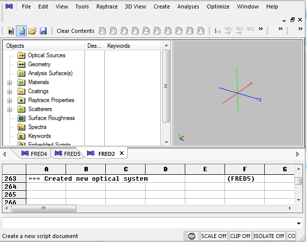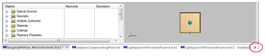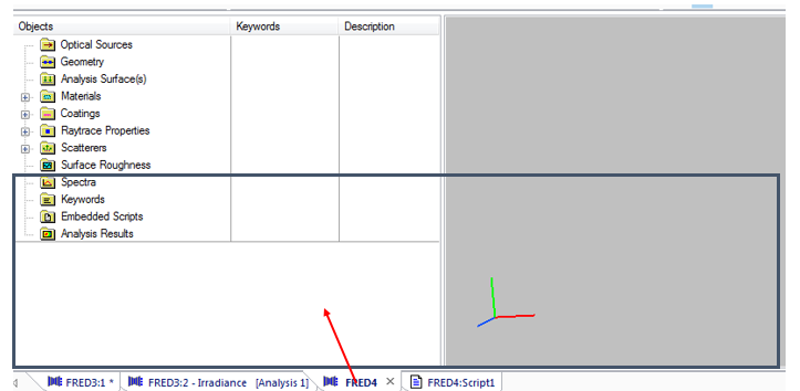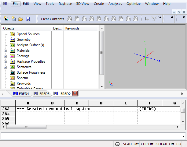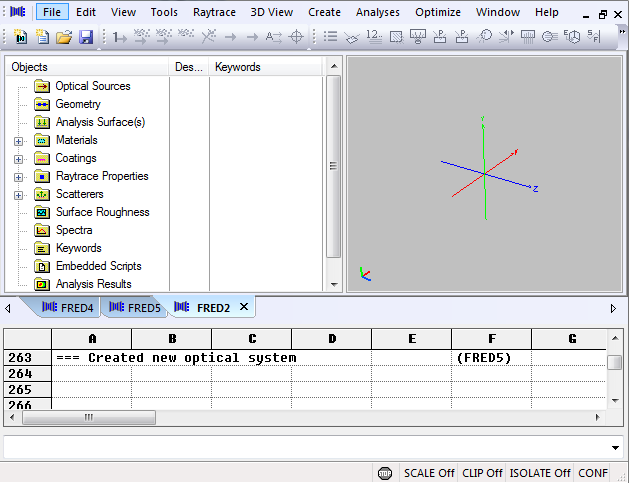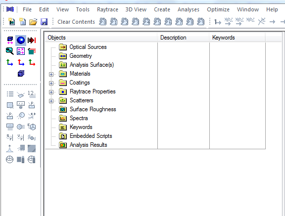 Since the toolbar groups can be rearranged by dragging them with your mouse (click on the three dots at the left side of each toolbar group), it is important to note that they can be docked at the top, bottom, left or right side your FRED window. For the left and right docking, however, all toolbar groups must be on the same side. Shown below is the case where the 3D view group and the analysis group are both docked on the left side of the window. The menu group can only be docked at the top of the window.