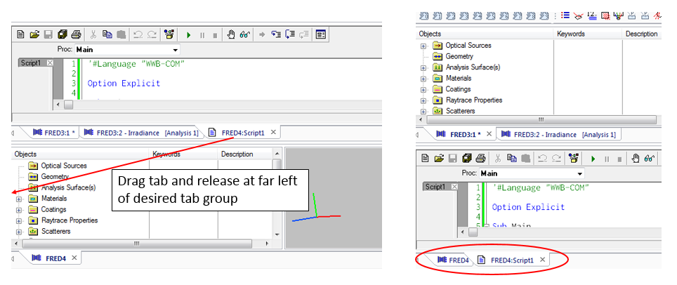 Tabs can now be moved between groups by dragging and dropping from one to the other. Additional tab groups can be created in the same manner as described above. When moving tabs between groups, the easiest approach is to drag the tab to the far left side of an existing group and release the tab. This procedure is depicted below, where we move FRED4:Script1 into the new tab group.
