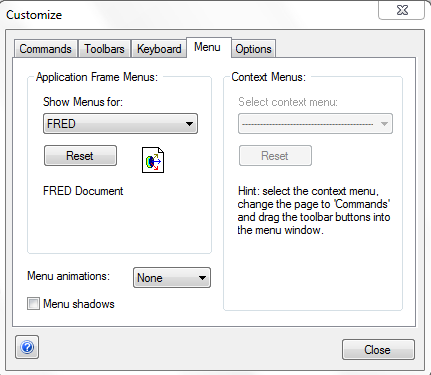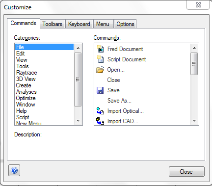 Commands The commands tab of the customization dialog is a full list of the available toolbar buttons that can be placed in your toolbars, with the various commands shown in corresponding categories. For example, the File commands include toolbar buttons for creating FRED documents, opening files, saving files, etc. Note that there is an All Commands entry in the Categories list that will show every available toolbar button in the program.