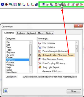 The toolbar buttons can be added by dragging and dropping the icons displayed in the commands window up to your toolbars and menus and dropping them. Similarly, toolbar buttons can be removed by dragging from your toolbars and menus back to the commands window. Shown below is the procedure for adding the 'Surface Incident/Absorbed Power' toolbar button from the Analyses category to an existing toolbar. The process for removing a toolbar button would be the reverse; drag from the toolbar down to the customization dialog.