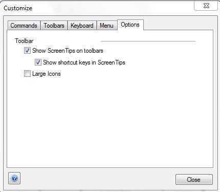 Options The Options tab of the Customize dialog has the following options: •Show Screen Tips on toolbars: Where available, hovering your mouse over a toolbar button will show a tooltip. •Show shortcut keys in Screen Tips: Where available, a tooltip will also display the accelerator key for that command. •Large Icons: Toolbar buttons are displayed in large icon mode. This may be useful for high resolution screens.