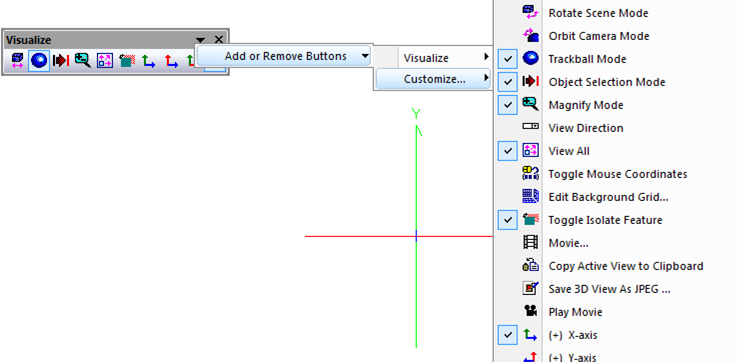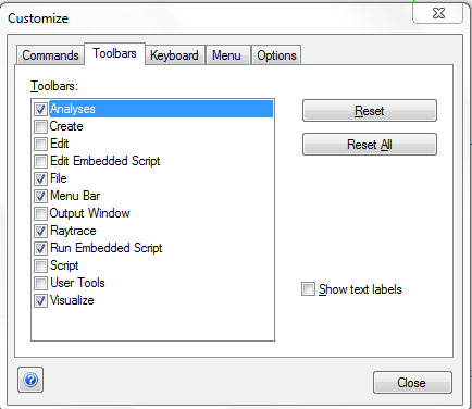 Toolbars The Toolbars tab allows you to toggle different toolbar categories active in your display. In the graphic below, only the Analyses, File, Menu Bar, Raytrace, Run Embedded Script and Visualize toolbar categories are displayed. For a selected toolbar, the reset button will reset any customization of that specific toolbar group and return the group to its initial state. The Reset All button applies the same reinitialization to all toolbar groups. The "Show text labels" option applies to the currently selected toolbar group and displays the text name of each toolbar button below the icon. Some points to keep in mind about the Toolbars: