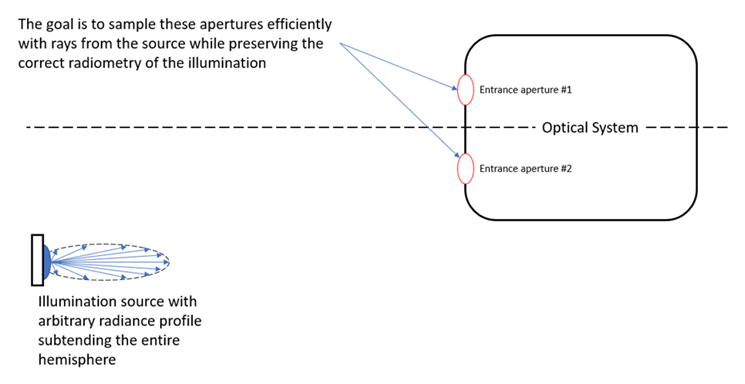 The relative orientation and emission characteristics of an illumination source with respect to the entrance aperture(s) of an optical system can affect the efficiency of your raytrace analysis. Consider the scenario below where an optical system with multiple, small apertures is illuminated by a source with an arbitrary radiance distribution. If rays are generated into the entire forward hemisphere (relative to the source), only a small fraction of those rays will enter the optical system through the apertures of interest. Consequently, a majority of the rays generated still need to be raytraced (adding computational overhead) but don’t add any additional information to the analysis being performed (presumed to be within the optical system assembly).