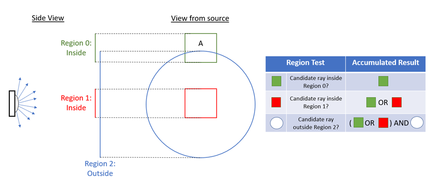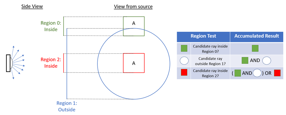 Determination of whether a candidate ray meets the requirements of the Acceptance Filter as a whole follows from a sequential processing of the individual Acceptance Regions. Processing of the Acceptance Regions proceeds by evaluating each region (from 0 to N) sequentially using the following rule(s).
