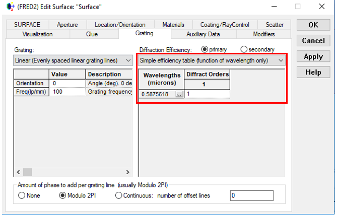 Note that this tool populates the existing table with efficiency values. All wavelength and orders desired to be included in the efficiency calculations should be added to the table prior to running the scalar diffraction efficiency calculator tool.