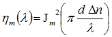 Diffraction efficiency and phase for a sinusoidal grating In a sinusoidal grating, the phase function is a sine wave. The diffraction efficiency at a specific order |m| and wavelength l is given by: