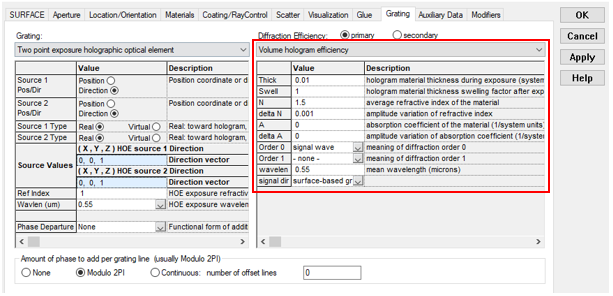 Two point exposure holographic optical element It is recommended that the "Two source user-recorded holographic optical element" be used when applying a Volume Hologram Efficiency specification, as the "user-recorded" implementation is more straightforward to setup than the "Two point exposure holographic optical element" and will include any aberration content of the recording setup. •With the two point holographic exposure grating specification, a signal wave will be generated with the volume hologram efficiency when a ray incident on the grating closely matches either one of Source 1 or Source 2 of the grating specification (keeping in mind the strong selectivity of the volume hologram efficiency with regard to incident angle and wavelength). •Toggling the real or virtual options in combination with the locations/directions of Source 1 and/or Source 2 of the two point exposure grating specification will turn the volume hologram into either a transmitting or reflecting grating. Multiple combinations of the source vectors and real/virtual toggles can result in the same behavior. •The "Ref index" parameter of the two point exposure construction defines the immersion index of the sources that were used to record the hologram. Changing "Ref index" does not affect the volume hologram efficiency calculation. Changing "Ref index" can affect the diffracted signal wave direction. The "Ref index" parameter should generally be set to a value of 1.0.