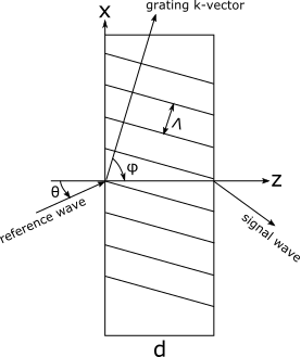 FRED can calculate the diffraction efficiency for volume holograms (Kogelnik, H. (1969). Coupled wave theory for thick holographic gratings. The Bell System Technical Journal 18(9) ) with polarized fields and some modifications that support volume gratings immersed in surrounding media which do not match the emulsion refractive index. Kogelnik's development of the diffraction efficiency for thick volume holograms with sinusoidal refractive index or absorption variations assumes that there are only two significant waves that contribute to the output of the grating; the reference wave (the input wave) and the signal wave (the grating response). Any other diffraction orders are assumed to be small contributors and can be ignored. For a slab of holographic emulsion with thickness d along the z-axis, the field energy along the z direction is conserved (or absorbed, if the material allows it) and the electric field of the signal wave at the entrance or exit face of the grating (for reflection or transmission holograms) can be calculated. The image below represents a thick holographic grating operating in transmission, with the k-vector being perpendicular to the grating fringes.