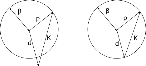 The total electric field within the grating is given by, E = R(z)exp{-i p x} + S(z)exp{-i d x}, with R being the reference wave and S being the signal wave. The direction of the signal wave, d, is related to the direction of the reference wave and the grating k vector through the relationship, d = p - K. When the amplitudes of the variations in refractive index and absorption are small, the propagation constant of the fields inside of the grating becomes b = 2pn/l and the vector d must satisfy b if energy is going to be efficiently transferred from the reference wave to the signal wave. As d increasingly deviates from the b requirement, the diffraction process becomes less and less efficient. Then, we have the following scenarios shown graphically below: