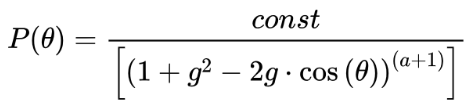 Where "const" is a normalization constant generated to produce a probability density function. The scattering anisotropy parameter g varies in the range -1 ≤ g ≤ +1; g = -1 corresponding to total backward scattering, g = 0 to isotropic (Rayleigh) scattering and g = +1 to total forward scattering (Mie scattering for large particles). When a = 0.5 this model yields the same results as Henyey-Greenstein.