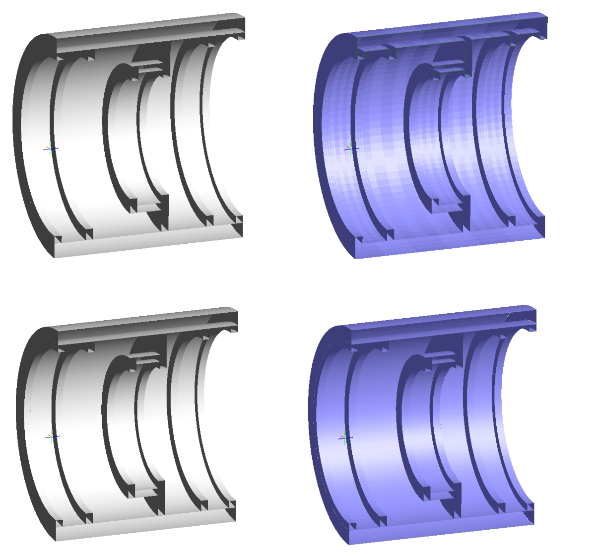 1 - Do you really need CAD?A common use case for CAD import is to bring in a mechanical housing for the optical system, perhaps to perform a study of the full system including stray light. However, in cases such as these the mechanics is often a rotationally symmetric tube with relatively simple internal structure to hold the lenses. In simple cases like this FRED native objects such as an Element Pipe, or a surface of revolution operating on a segmented curve, could be used to create the same shape without the use of NURB's and therefore be much faster to trace. Figure 1 (below) shows four different representations of the same mechanical geometry, only one of which features CAD NURBS.
