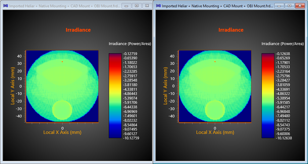 Figure 2. Stray light irradiance result generated due to lens mounts represented by faceted OBJ representation (Left) and CAD NURBS (Right)