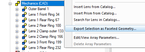 2 - Is a faceted surface sufficient?The original CAD file might be complex to the point that FRED native surfaces are not suitable to represent them, or take too much effort to rebuild within FRED, but we still may be able to to generate a good result without needing NURBS surfaces. It is often the case that the mechanics surface finish will be highly diffuse to limit stray light contributions, and where scatter is the primary mechanism for the outgoing rays a faceted surface representation may be sufficient. A faceted OBJ representation is often available as a simple export option from the original CAD software, or can be created from the CAD object after import into FRED using the R-Click option to Export Selection as Faceted Geometry: