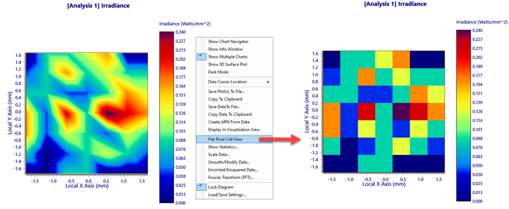 For low pixel and/or ray counts on an analysis surface or detector, the barycentric (triangular) interpolation scheme used by LightningChart can introduce a visual artifact in the form of an asymmetry which may look hexagonal or triangular. This is purely an effect of the interpolation scheme and the displayed asymmetry is not present in the underlying data.