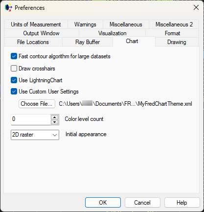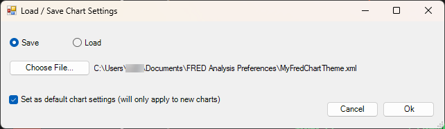 Optionally, when loading or saving the GlobalSettings, those settings can also be set as the default chart settings for new charts. In this case the applied settings file will be shown in the Tools... Preferences... Chart tab: