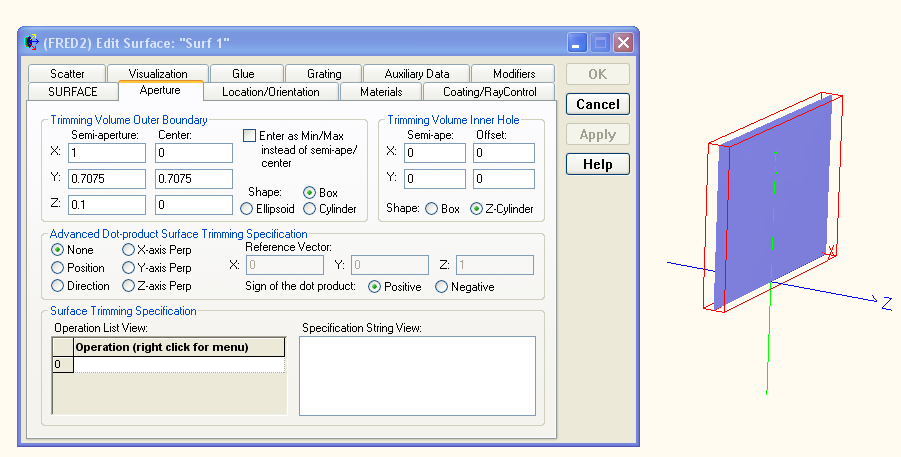 The default settings on the aperture tab will create a Trimming Volume Outer Boundary which is 2 units in X and Y diameter and 2 units along Z in depth. By hitting "Apply" and then selecting the newly created surface on the Object Tree (by default this will be "Surf 1" in the custom element node "Elem 1") you will see the bounding volume drawn in red in the 3D view. Notice that if the Trimming Volume Outer Boundary shape is changed from Cylinder to Box on the Aperture tab of the surface dialog that the shape of the plane then becomes a square.