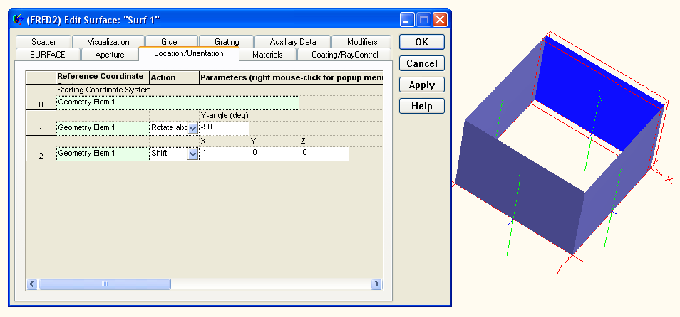 In general, properly positioning each of the four surfaces with the correct orientation will require a rotation about the Y-axis and a shift along either the X or Z axes. Operations can be added, inserted or appended to the operations list by right mouse clicking in the list and selecting the appropriate option from the list menu. An example of the operations list applied to a surface is shown below along with the resulting configuration after all four surfaces have been positioned.