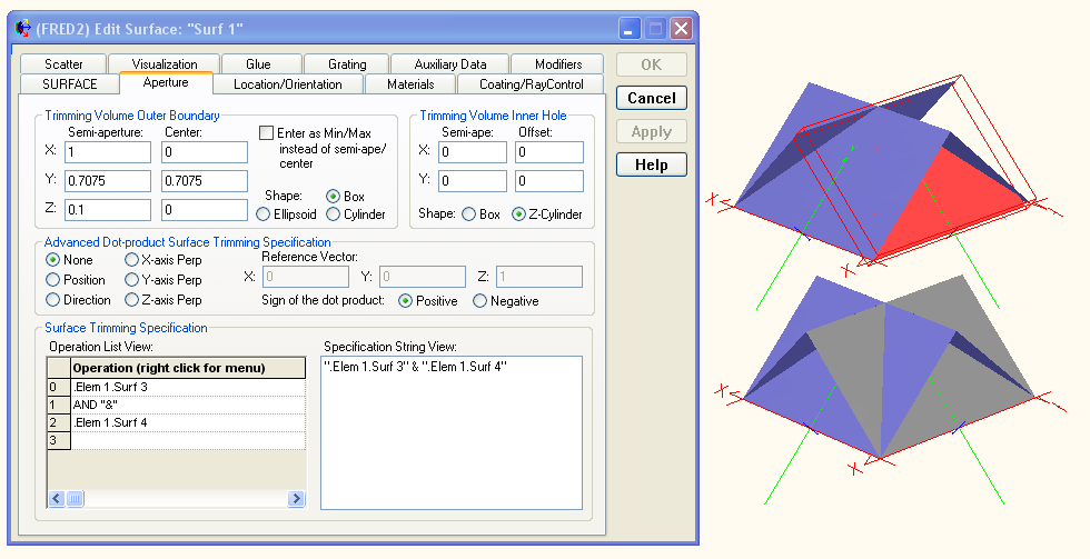 Step 5: Trim the excess from each surface At this point the base pyramid is constructed but we wish to trim away the unnecessary areas of each plane. This can be accomplished in the Aperture tab of each surface dialog in the "Surface Trimming Specification" section. For a detailed description of trimming operations in FRED, please see the help topics Apertures, Trimming Volumes and Trimming Objects and Trimming Logic.