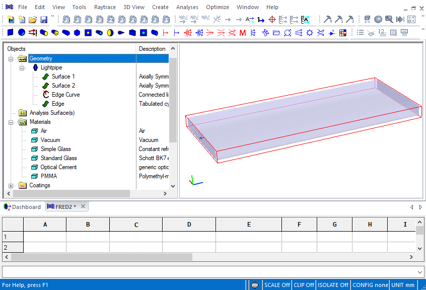 Building Lightpipe Geometry Begin the Tutorial by opening a blank FRED document (File>New>Fred Type, keystroke Ctrl+N or Toolbar button