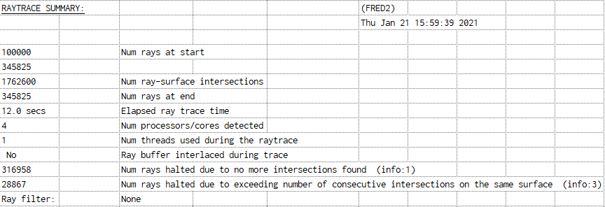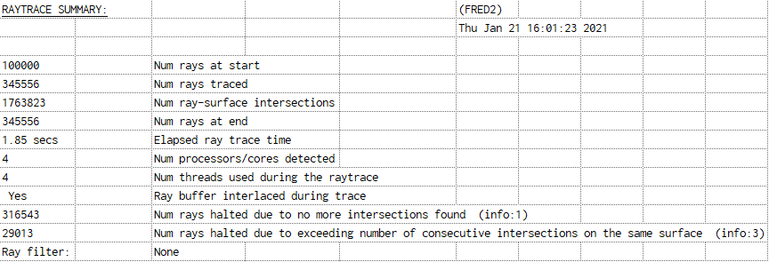 Note that the entry "Num rays halted due to exceeding number of consecutive intersections on the same surface (info:3)" appears in both Figures 1-8 and 1-9. This message will be discussed in the following section in context of our analyses of the system.