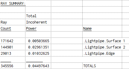 Figure 1-10. Ray Summary after raytrace of lightpipe.