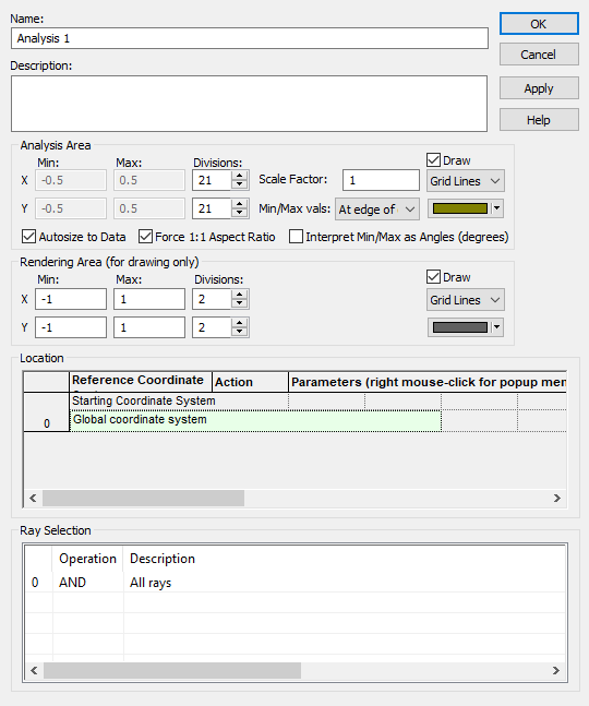 The Location option for an Analysis Surface determines the Reference coordinate system in which the calculation is to be performed. While the default is the Global coordinate system, generally the coordinate should be that of a specified surface. The Ray Selection option determines which rays are to be used in the calculation. While the default is All rays, only those rays currently on the surface of interest should be selected. Both the Location and Ray Selection can be set manually or set simultaneously by drag-and-drop of the Analysis Surface onto the surface of interest. For more detailed explanation of Analysis Surface options, navigate to its Help page using this link Analysis Surfaces.