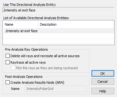 The call for an Intensity Spread Function pops a dialog as shown in Figure 1-24. This dialog allows the user to select among the available Directional Analysis Entities which is to be used for the calculation. Here we have only one to choose from; Intensity at exit face. However, in general, any number of Directional Analysis Entities can be defined and all will be presented in this list when the Intensity Spread Function is requested. The user must select the specific Directional Analysis Entity to be used for the current calculation. Note also the Pre-Analysis Ray Operations options. If a raytrace has been executed prior to the Intensity Spread Function request, then these options are unchecked. The user simply selects the OK button to proceed. On the other hand, if the Intensity Spread Function is requested before any raytrace, these options allow for the raytrace to be executed from this dialog before the calculation proceeds.