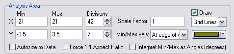 To more clearly display the Irradiance calculation, we choose to make some changes to the Analysis Surface default Analysis Area settings as shown in Figure 1-20. The intent will be to create 1mm2 pixels with a padding of one millimeter in both dimensions. Forcing the outer pixels to zero produces a more pleasing contrast between minimum and maximum. To that end, the Autosize to Data and Force 1:1 Aspect Ratio options must be disabled[unchecked]. Next, the Min & Max values in X and Y are set to [-21,+21] and [-3.5, +3.5], respectively. Note that the Min/Max vals option default setting indicates that these dimensions are measured At edge of outer pixel. Based upon theses X & Y dimensions, the number of Divisions must be set to 42x7 to achieve 1mm2 pixels.