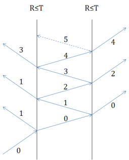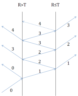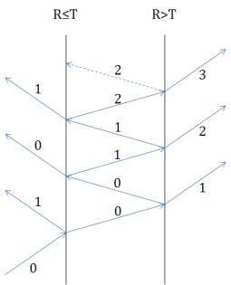 (c) Figure 1-13. Ancestry splitting of incident parent (0): a) R≤T both surfaces, b) R≤T, R>T, c) R>T, R≤T, d) R>T both surfaces.