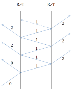 With regard to the second point above, note that the Total Incoherent Power is still about 0.15% less than the assigned source power of 0.045. This slight discrepancy results from the Ancestry Level Cutoff option on the Raytrace Property. The term ancestry incorporates the concept of generations commonly associated with parent, child, grandchild, etc. These generations may also be denoted numerically as 0,1,2,3..... Figure 1-13 illustrates generational splitting in four distinct cases when a single ray is incident upon successive surfaces. The Ancestry Level Cutoff option halts creation of rays beyond the given generation. The default specular ancestry for all Raytrace Property controls is set to 2 meaning that up to two specular generations are allowed. The termination of generations higher than 2 is therefore the reason for the 0.15% power discrepancy. Since these generations are not created, the power associated with them is permanently lost in the power accounting process.