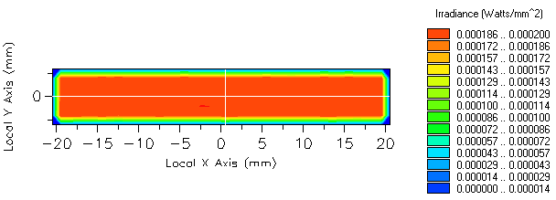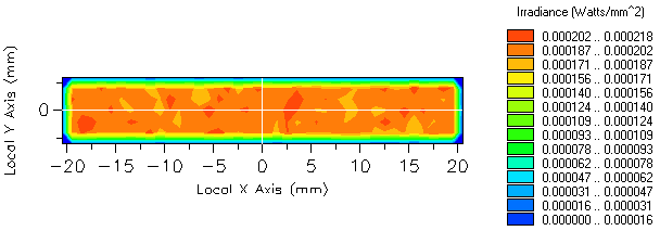 The resulting irradiance at the lightpipe exit face calculated with a) 100k and b) 1000k rays is show in Figure 1-22 (the ray counts can be increased by editing the source node and modifying the number of starting ray positions). These results offer an opportunity to highlight the statistical aspect of "Energy" calculations which is particularly applicable to illumination. Since the source is traced as a set of randomly-generated ray positions and directions, "Energy" calculation results are governed by Poisson statistics which states that the signal-to-noise ratio associated with each pixel is proportional to √N where N is the number of rays per pixel. Examination of the plot levels reveals the predicted 3x decrease in peak-to-valley variation across the central portion of the irradiance patterns between a) and b).