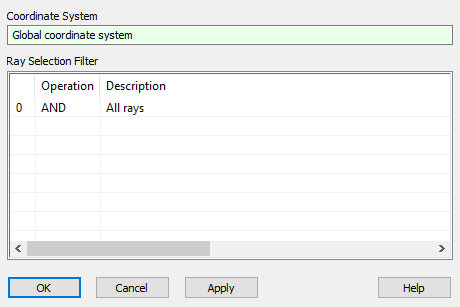 One simple change need be made to our source definition in order to calculate the PSF. Open the dialog for "Source 1" and navigate to the Coherence Tab. Note that the default setting for all sources is "Not Coherent" meaning that all rays are treated as incoherent and therefore not capable of displaying coherent effects such as diffraction or interference. Select the option "Coherent" as shown in Figure 3-1. Navigate to the Positions/Directions Tab and enable only the 0° field angle and press the Apply button.