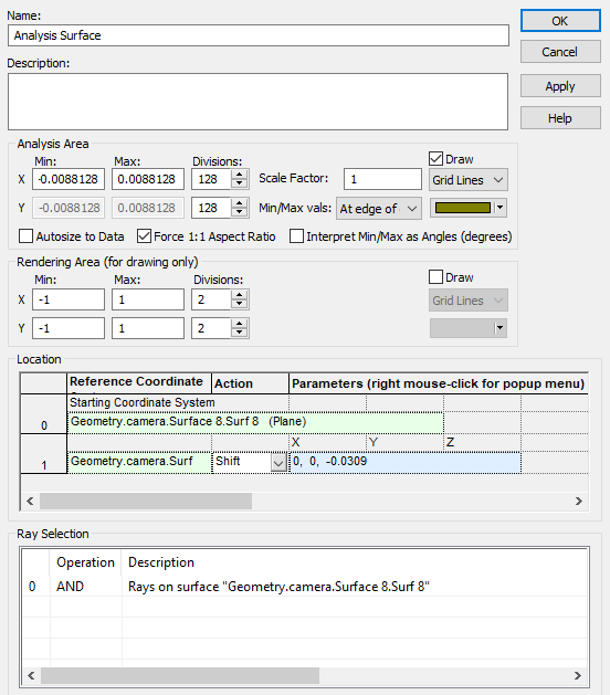 where w is the Analysis Surface half-width, N (=2n) is the number of pixels across the Analysis Surface, λ is the wavelength and ƒ# is the f-number. From Figure 3-4, we have ƒ#=5.1 and a center wavelength of 0.54 μm such that the cutoff frequency vc=1/(λƒ#)=360 lpmm. To that end, we select N=128 which yields w=0.0088128 cm. The properly configured Analysis Surface dialog is shown in Figure 3-7.