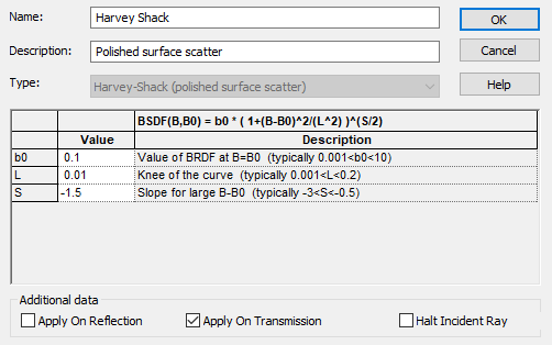 Open the dialog for the Harvey Shack model by double-clicking on its entry in the Scatterers folder. We will accept the default values for b0, L & S. Note the Additional data options Apply on Reflection, Apply on Transmission are both checked as defaults. Note that the equation for the Harvey Shack Bi-Directional Scatter Distribution Function (BSDF) is displayed in the dialog. Since this particular exercise will deal only with scatter in transmission, i.e., scatter towards the image plane, uncheck the option Apply on Reflection. The option Halt Incident Ray is unchecked and will be left in that state since the surface is a highly specular surface. The intent then is to generate scattered rays in addition to the specular component. Under this condition, FRED will subtract the Total Integrated Scatter (TIS) power from the incident ray before allowing the specular component(s) to proceed. Accept the changes as shown in Figure 3-10 by pressing the OK button.
