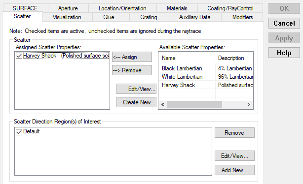 Having assigned the Harvey Shack model to our lens surfaces, open the dialog box for the second surface of the third lens "Geometry.camera.Lens 6-7.Surface 7" and navigate to its Scatter Tab as shown in Figure 3-13. Note the presence of two general sections in this dialog tab, Scatter and Scatter Direction Region of Interest. The Scatter section lists the Available Scatter Properties containing scatter models from the Scatterer folder on the right-hand side. New scatter models can be created (Create New..) or existing scatter models can be edited (Edit/View) using the buttons provided. The Assigned Scatter Properties box lists all scatter models currently assigned to the surface. [More than one scatter model can be assigned to a given surface.] Note the check box next to the Harvey Shack model which allows the model to be enabled or disabled.