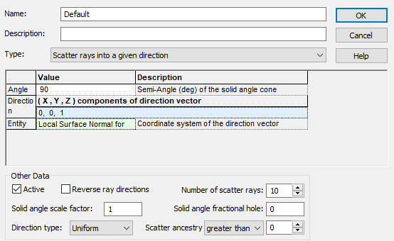 There are six types of Importance Sampling Specifications. Detailed descriptions of these are provided in Scatter Properties Help topic. The Other Data section provides additional parameters for controlling the functionality of this feature and are also discussed in the Help documentation. We accept the default settings for these parameters in this demonstration.