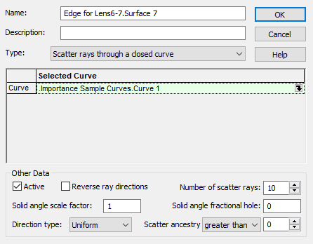Open the surface dialog for "Geometry.camera.Lens 6-7.Surface 7". Navigate to its Scatter Tab and double-click on the Default "Scatter Direction Region of Interest" entry to open its dialog. Select the type Scatter rays through a closed curve then select the newly created curve ".camera.Importance Sample Curves.Curve 1". Rename this "Importance Sampling Specification" to "Edge for Lens6-7.Surface 7" as shown in Figure 3-16. Press the OK button on this dialog to accept these changes then press the OK button on the Surface dialog box finalize the assignment.