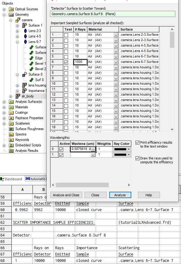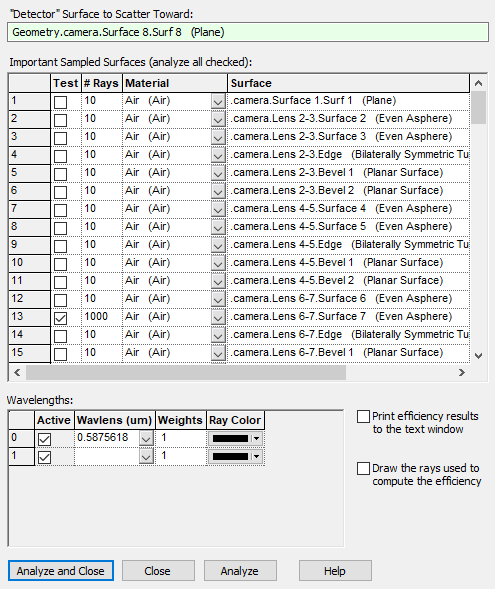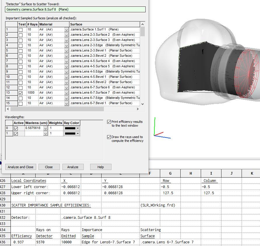 It is highly recommended that each new Importance Sampling assignment be tested. FRED offers a feature designed specifically for this purpose. The Analyze Scatter Importance Sampling feature is found on the Tools Main Menu. To test the Importance Sample created above, select the image plane surface (Geometry.camera.Surface 8.Surf 8) as the "Detector" Surface to Scatter Toward, check the Test box for Lens 6-7.Surface 7, enter 1000 in the # Rays column then check both boxes at the bottom right of the dialog to Print efficiency results to the text window and Draw the rays used to compute the efficiency as shown in Figure 3-17. Press the Analyze button and examine the raytrace shown in the 3D View and the Output Window as shown in Figure 3-18.
