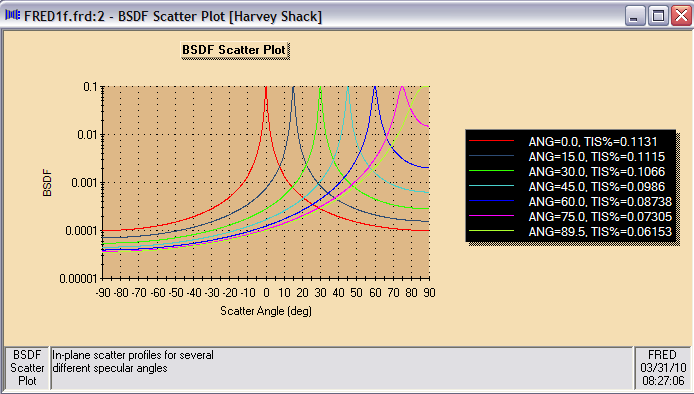 A convenient and helpful feature in FRED's GUI interface is the ability to generate plots for any Scatterer, Coating or Material. Highlight the Harvey Shack entry in the Scatterers folder, right-click and choose the option Plot 2D (Angle) near the bottom of the pop-up menu. The plot shown in Figure 3-11 will promptly appear. This log-plot is of the BSDF versus scatter angle for selected angles of incidence. Note also the TIS values for these angles are tabulated in the legend on the right of the plot. For the particular parameters of this Harvey Shack model, scatter removes only a fraction of a percent of the total flux from an incident ray.
