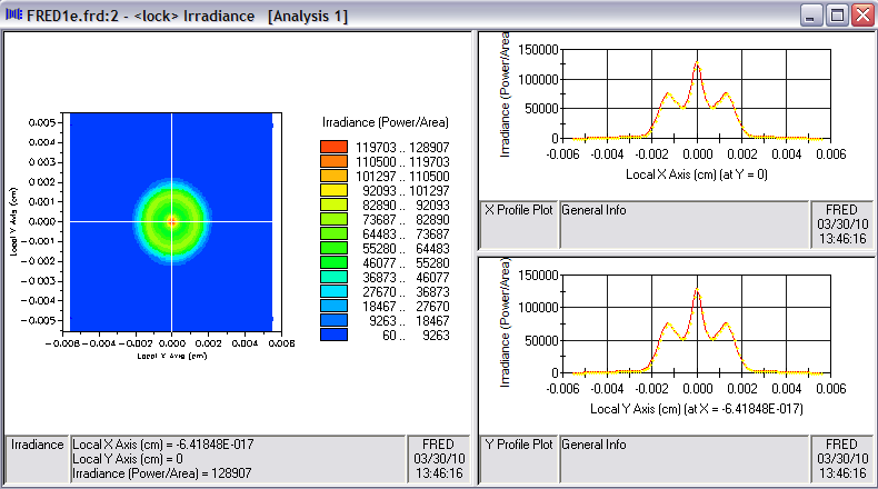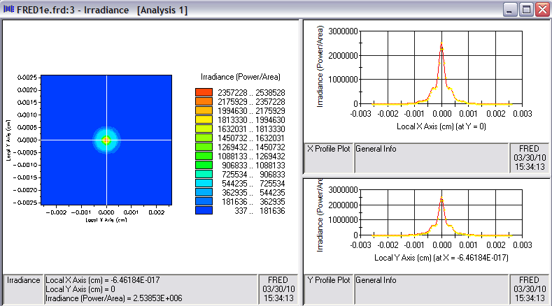 For this exercise, we choose the second option and apply the shift only to the Analysis Surface as shown in Figure 3-5. The resulting irradiance calculation shown in Figure 3-6 is more compact (note XY scale reduced by 2x) and has a higher peak value (20x increase) confirming the earlier suspicion that the lens was out of focus.