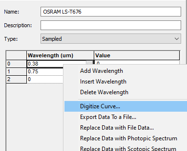 Before we create the new LED source model, we will define the wavelength emission spectrum as a new node in the Spectra folder on the object tree. Right mouse-click on the Spectra Folder on the object tree and select Create New Spectrum from the context menu. In the resulting dialog, enter the name "OSRAM LS-767" and set the spectra type to be "Sampled" as shown in Figure 2-2. Now right-click in the table area and select the option Digitize Curve.