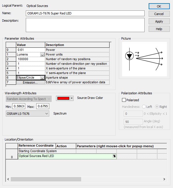 Finally, we select the "OSRAM LS-T676" spectrum in the Wavelength Attributes portion of the dialog and set the Source Draw Color to be red. The new source has its starting coordinate system in the Location/Orientation section of the dialog set to be coincident with the original "Red LED" source node. The final Source Primitive construction dialog is shown below in figure 2-4. Press the OK button on the dialog to add this new source node to the Optical Sources folder on the object tree.