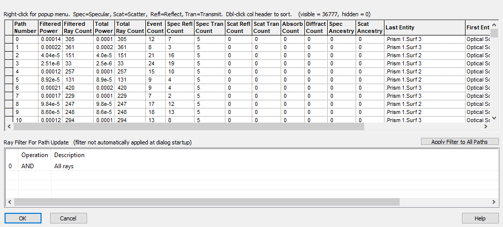When a raytrace is initiated with the Create/use ray history file and Determine raypaths options selected, FRED stores each intersection for each ray in a history file and groups rays into "raypaths" defined by unique sequences of surface intersections. This information is accessed through the Raytrace Paths Summaries dialog found on the Main Menu Tools>Reports>Raytrace Paths. Layout of the Raytrace Paths Summaries dialog is in spreadsheet format as shown in Figure 2-17 where each row represents a unique "path" through the system.