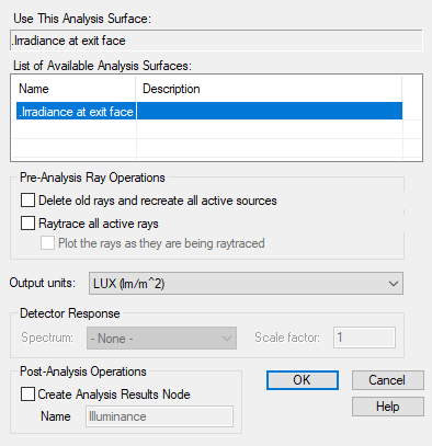 Begin by tracing the source "OSRAM LS-T676 Super Red LED" using Trace All Sources option, thereby avoiding rays being drawn to the screen. Recall that Trace All Sources also uses all available threads (CPUs) resulting in a faster raytrace. Once the raytrace finishes, initiate the Illuminance calculation as indicated above. Just as with the Irradiance and Intensity calculations made in the Basic Tutorial, a dialog will appear allowing the selection of the analysis surface to be used in the calculation. In the case of an Illuminance calculation, this dialog has a slightly different format as shown in Figure 2-5. In addition to the List of Available Analysis Surfaces and the Pre-Analysis Ray Operations options, the user can select from one of the standard Output Units associated with Illuminance; Lux (lm/m2), phot (lm/cm2), foot-candles (lm/ft2) or lumen/(system unit)2. There is also facility for calculation in arbitrary units based upon a Detector Response (see Illuminance Help page for more details on this option). For the purposes of this tutorial, we select the most common Illuminance unit, Lux (lm/m2).